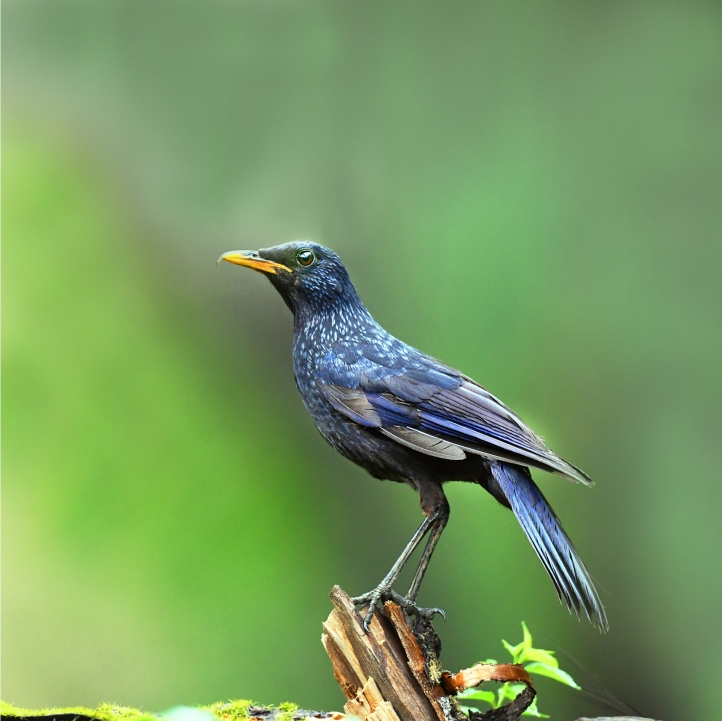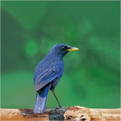 科鸟类,体长28~33cm。全身羽毛呈黑暗的蓝紫色,各羽先端具亮紫色的滴状斑,嘴、脚为黑色,此鸟远观呈黑色,近看为紫色,头及颈部的羽尖具闪光小羽片。虹膜褐色;嘴黄色或黑色;跗跖深褐色。