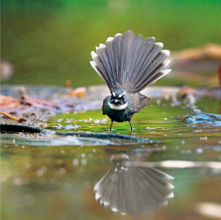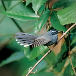 ,体长17~20cm。通体黑灰色,头部较暗,近黑色,颏、喉、眉纹白色,在暗色的头部极为醒目。下体深灰而有别于白眉扇尾鹟,但有个别下体色浅。尾较长而宽,常散开呈扇状,除中央一对尾羽外,其余尾羽均具宽阔的白色尖端。虹膜褐色;嘴黑色;跗跖黑色。