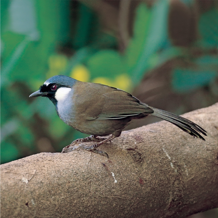 外形特征:中型噪鹛,体长23~29cm。头侧及喉黑色,脸颊白色。黑喉、眼后有一大块白斑。虹膜红色;嘴黑色;跗跖灰黑色至肉色。