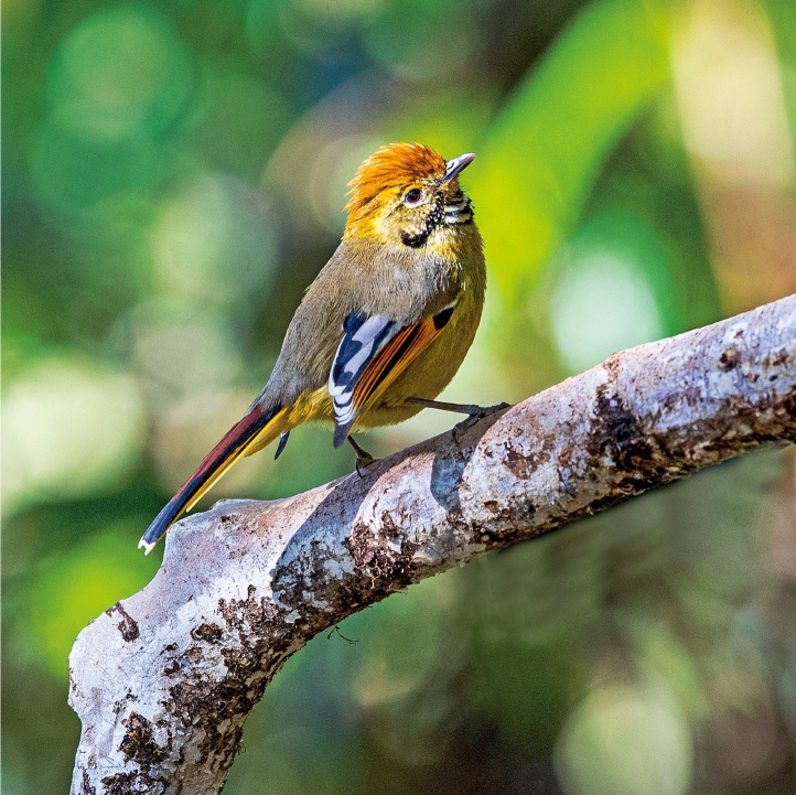 外形特征:中型鹛类,体长15~18cm。头具羽冠,前额和头顶羽冠金黄褐色,头侧灰黄色具黄色眼圈。上体灰橄榄绿色,外侧飞羽表面橘黄色、基部具黑色翼斑;内侧飞羽表面淡灰色具黑色亚端斑和白色端斑。尾羽黑色,基部栗色,羽缘和羽端黄色。颊黑色,颏橘黄色,喉白色具黑色横斑,其余下体淡黄色。虹膜褐色;上嘴灰褐色或暗褐色,下嘴灰黄色或灰褐色;跗跖暗灰色。