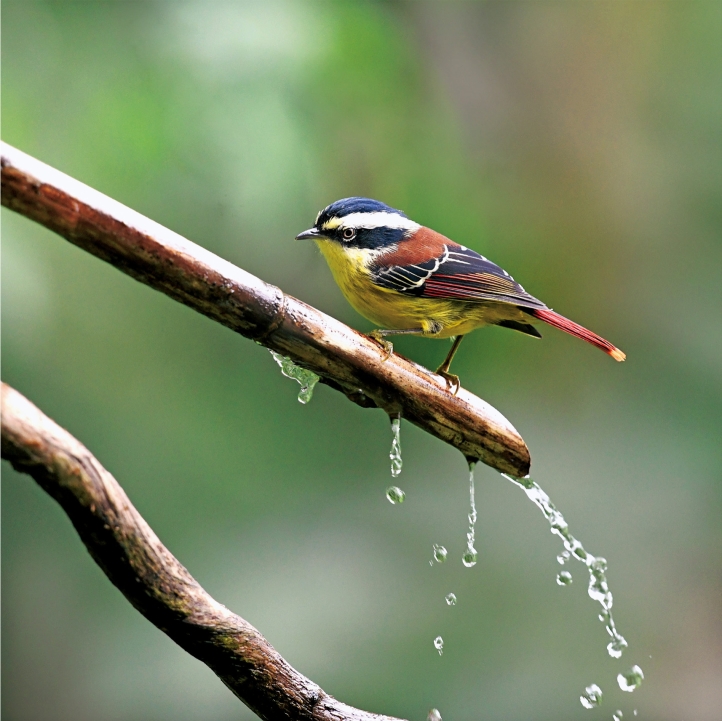 外形特征:较小型鹛类,体长12~15cm。具宽阔的白色眉纹与黑色的顶冠,尾缘及初级飞羽羽缘均红色。背橄榄灰色,两翼余部黑色而缘白,尾中央黑色,下体白而略沾奶色。雌鸟及幼鸟翼羽羽缘较淡,尾缘粉红。虹膜灰色;嘴灰色;跗跖黄褐色。