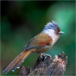 外形特征:中等体型,体长22.5cm。头顶具浓密的冠羽,前额栗棕色,头顶灰褐色。上体棕褐色,两翅棕褐色具黑色横斑,翅基外缘有一黑斑,尾呈凸状,棕褐色具黑色横斑。下体棕褐色,腹中部白色。虹膜褐色、红褐色或橄榄黄色,嘴淡角褐色或铅褐色,下嘴乳黄色或褐黄色,脚淡褐色或灰褐色。