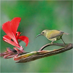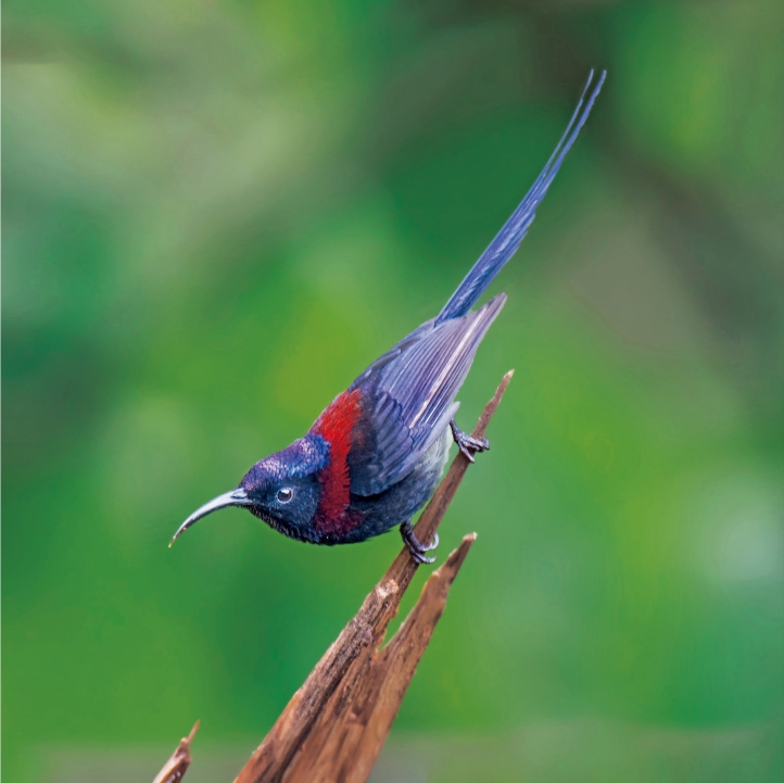 外形特征:花蜜鸟,雄鸟体长14~15cm,雌鸟体长10cm。雄鸟中央尾羽特长,尾呈楔形。头顶至后颈紫蓝色,背褐红色,腰有一黄色横带。上背暗淡紫色,喉黑,胸灰橄榄色而具细小的深暗色纵纹。虹膜褐色;嘴黑色;跗跖深褐色。