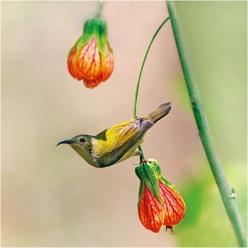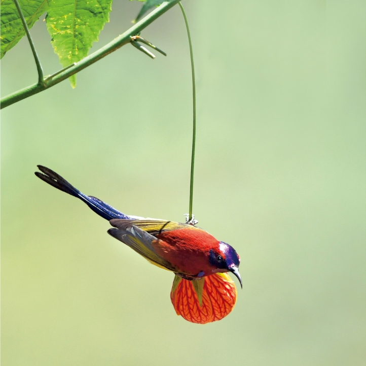 外形特征:花蜜鸟,体长11~16cm。雄鸟前额至头顶、颏和喉辉紫蓝色,背、胸、头侧、颈侧朱红色,腰腹黄色,中央尾羽紫蓝色。雌鸟上体橄榄色,下体绿黄,颏及喉烟橄榄色。虹膜深褐色;嘴黑色;跗跖黑褐色。