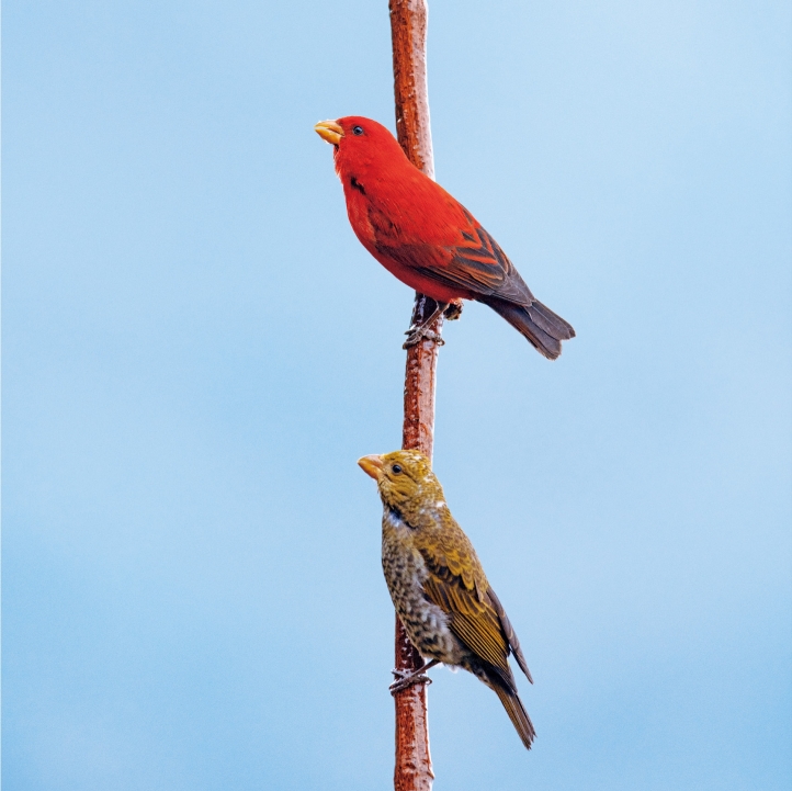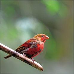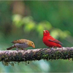 外形特征:中型燕雀科鸟类,体长17~18cm。雄鸟醒目,全身猩红色,飞羽偏黑而羽缘红色。雌鸟上体橄榄褐色,下体灰,具偏深色的杂斑,腰黄。雄性幼鸟似雌鸟但上体具棕色调,腰橘黄色较多。虹膜深褐色;上嘴粉褐色,下嘴角质黄色;跗跖褐色。