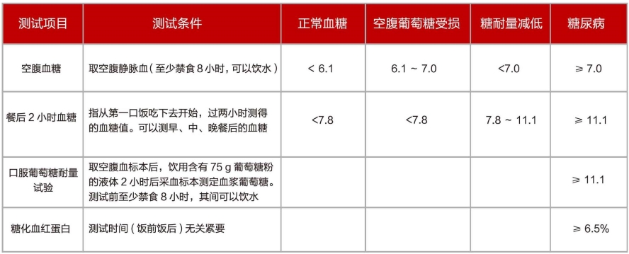 空腹血糖、随机血糖或餐后2小时血糖是诊断糖尿病的主要依据,没有糖尿病典型临床症状时,必须重复检测以确认诊断。