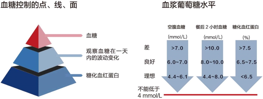 注:图中血糖控制的理想水平主要是针对60岁以下的人群;60岁以上人群,年龄每增加10岁,空腹和餐后2小时血糖控制目标应上调1~2 mmol/L。