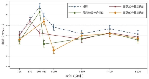 运动与单纯服药相比,用餐服药后30、60和90分钟进行30分钟的间歇有氧运动,均能不同程度降低血糖水平。