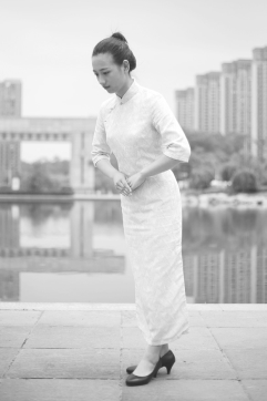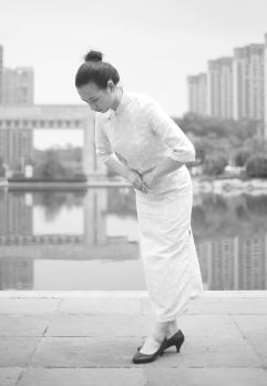 以站姿为准备,两手平贴大腿徐徐下滑,上半身平直弯腰,弯腰时吐气,直身时吸气。弯腰到位后略做停顿,再慢慢起身,同时手沿大腿上提,恢复站姿。“真礼”要求行90度的弓形礼,如图1-18所示。“行礼”仅双手至大腿中部即可,头、背与腿约呈120度的弧度,如图1-19所示。“草礼”只需将身体向前稍做倾斜,两手搭在大腿根部即可,头、背与腿约呈150度的弧度,如图1-20所示。