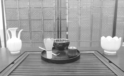 (4)置茶:左手取抹茶罐,右手打开罐盖,放在茶巾上。右手取茶匙,头部搁于茶叶罐口,右手从茶匙末端滑下,托住茶匙柄部,换成握铅笔状,探入茶罐取茶粉。舀茶粉1平匙,放入茶盏,茶匙在盏5点钟位置轻敲一下,以使黏在茶匙上的茶粉脱落。收回茶匙,放回原位。加盖,将茶罐放回原位。