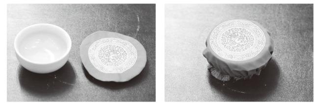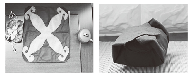 包壶巾是用以保护壶、盅、杯等的包装布,以厚实而柔软的织物制成,四角缝有雌雄搭扣,如图6-53所示。