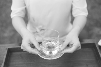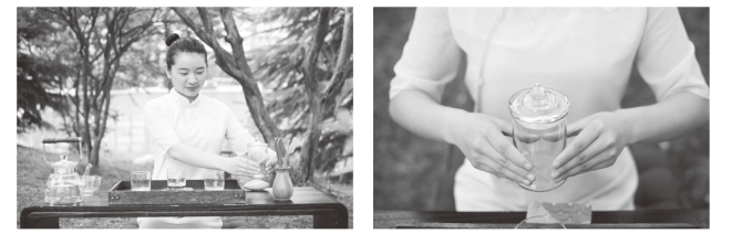 双手伸出及收回动作同前法,端物件时双手手心向上,掌心向下凹作“荷叶”状,平稳移动物品,如图6-59所示。多用于端取奉茶盘、赏茶盘、扁形茶荷、茶点盘、杯托等。