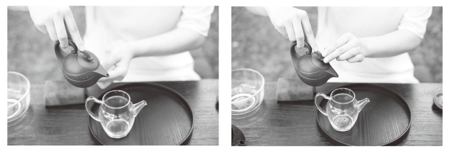 单手持壶法:食指放在提梁的上方,其余四指握住提梁,用食指的指力轻轻下压提梁注水。双手持壶法:右手握提梁方式同单手持壶法,左手食指、中指按住壶盖或盖钮,如图6-65所示。