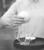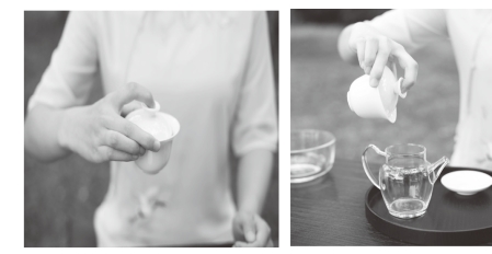三指侧握式:盖子调整好合适的开口,食指放在盖钮上,拇指和中指握住碗沿两侧,无名指和小指弯曲并在中指边上,不与盖碗接触,把盖碗垂直即可出汤。如图6-66所示。