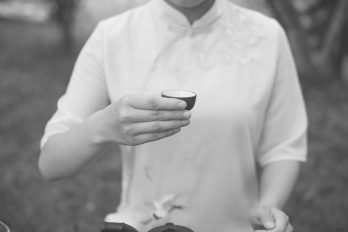 三龙护鼎法:右手虎口分开,大拇指、食指握杯两侧,中指抵住杯底,无名指及小指自然弯曲;女士可以将无名指与小指微跷,左手指尖可托住杯底,如图6-70所示。