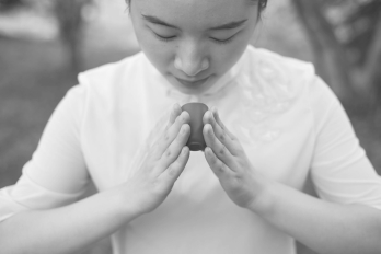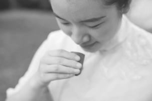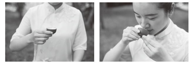 方法一:单手虎口分开,用大拇指和其余四指扶杯身,置鼻前嗅闻茶香。方法二:单手虎口分开,拳状握杯身置鼻前嗅闻茶香。方法三:双手掌心相对虚拢成合十状,除拇指外的四指捧杯置鼻前嗅闻茶香。如图6-72、图6-73、图6-74所示。