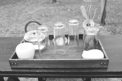 托盘(1个)、奉茶盘(1个)、玻璃提梁壶(1把)、水盂(1个)、无刻花透明玻璃杯(3个)、玻璃片(3块)、茶荷(1个)、茶巾(1块)、茶叶罐(1个)、茶道组(1套)。