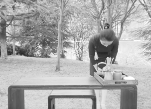 步骤11:奉茶。取奉茶盘,依次将茶奉给宾客。每奉完一杯茶,注意移动盘内杯子,使杯子均匀分布,再继续奉茶,奉茶后回茶台。如图9-11所示。