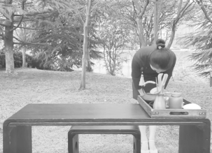 步骤1:入场。双手端盘入场,茶盘高度以舒适为宜,行走至茶台,放下茶盘。