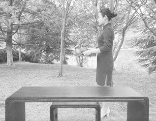 步骤13:收具。依次收具,器具按原来拿取的路线放回茶盘。起身退至茶台侧后方,行鞠躬礼。如图9-13所示。