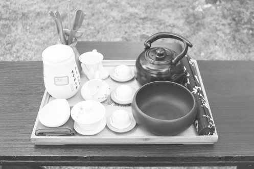 茶席(1块),托盘(1个),奉茶盘(1个),提梁壶(1把),水盂(1个),白瓷品茗杯(3个),杯托(3个),瓷盖碗(1个),滤网及滤网架(1套),公道杯(1个),茶巾(1块),茶荷(1个),茶叶罐(1个),茶道组(1套)。