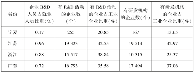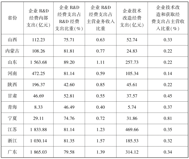 表7.6 黄河流域企业层面创新投入(企业人员与研发机构)与苏、浙、粤三省比较(2018)