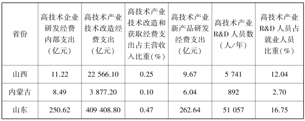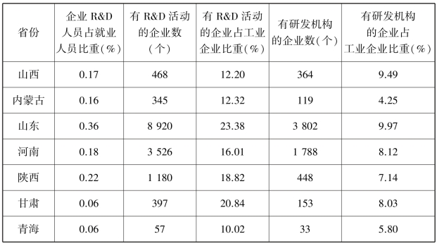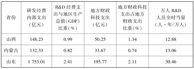 从表7.3涉及创新的研发经费这一关键性指标以及地方财政科技支出情况可以看出,不论是R&D经费的内部支出还是地方财政科技支出,黄河流域各省(自治区)包括山东省在内均存在较大差距。以地方财政科技支出占地方财政支出比重这一代表地方政府对科技创新的支持力度的重要指标来看,黄河流域8省(自治区)中这一比值最高的为山东省,占比为2.11%,但苏、浙、粤三省分别为4.03,4.03和5.48,在万人R&D人员全时当量指标上也呈现相同的情况。这些监测数据清晰地显示出,在科技创新的投入力度上,黄河流域各省(自治区)相对不足,制约了本省(自治区)科技创新能力水平的提高。