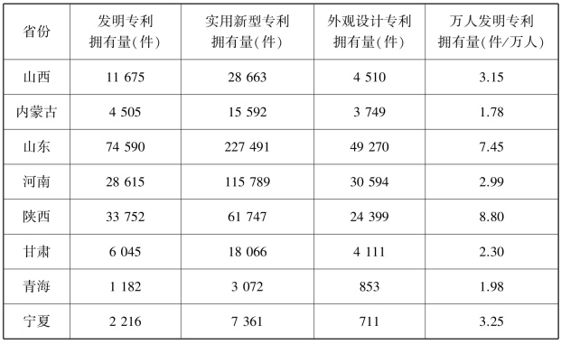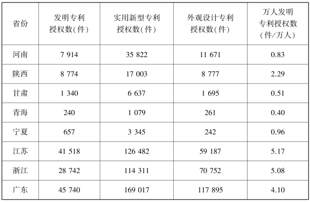 与创新投入相对不足对应,在创新产出指标上,见表7.7和表7.8,黄河流域各省(自治区)在发明专利、实用新型专利、外观设计专利以及万人发明专利的授权数和拥有数等若干指标上与苏、浙、粤三省差距较大。通过万人发明专利授权数这一指标看,苏、浙、粤三省分别为5.17,5.08和4.10,而黄河8省(自治区)中最高的陕西省只有2.29,山东省作为东部经济大省,虽然GDP排名全国第三,但这一指标也仅为1.91,有着明显的差距。而在万人发明专利拥有量这一指标上,各省(自治区)与苏、浙、粤三省的差距则更为明显,三省的数据分别为22.41,19.44和18.67,而黄河流域8省(自治区)中最高的陕西省为8.80,山东省为7.45,均显示出了明显的差距。
