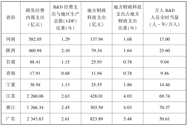 表7.3 黄河流域创新基础性指标(研发经费与地方财政支持)与苏、浙、粤三省比较(2018)
