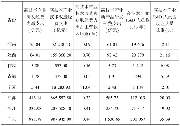 表7.5 黄河流域高技术企业创新投入(企业R&D经费支出、人员)与苏、浙、粤三省比较(2018)