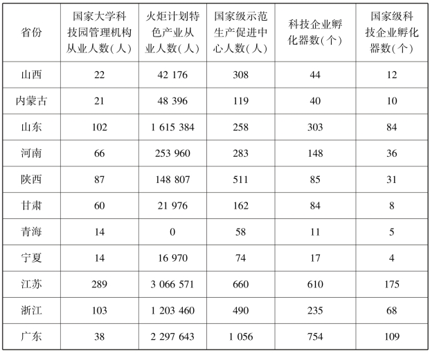 表7.2 黄河流域各省(自治区)创新基础性指标(人员与孵化器)与苏、浙、粤三省比较(2018)