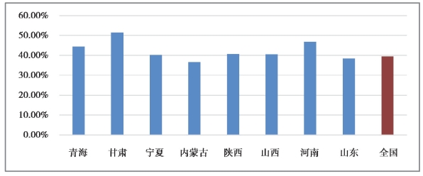 图9.5 黄河流域8省(自治区)及全国乡村人口占总人口的比重