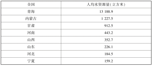 黄河流域气候条件复杂、生态系统多样,随着近年来社会经济的快速发展,水资源数量和质量在空间和时间上不平衡的矛盾不断加剧。河北、宁夏和山东3省(自治区)是水资源最匮乏的地区,其中,河北、宁夏人均水资源量不足200立方米(表9.2)。下游的山东作为工业和农业大省,降水季节性分布很不均衡,全年降水60%~70%集中于夏季,易形成涝灾,冬、春及晚秋易发生旱象,特定的地理位置和气候条件决定了洪旱频发、旱涝急转的态势,对农业生产影响很大。