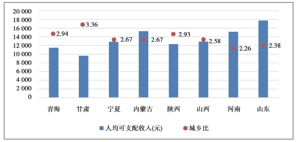 图9.6 2019年黄河流域8省(自治区)农村居民人均可支配收入及城乡比