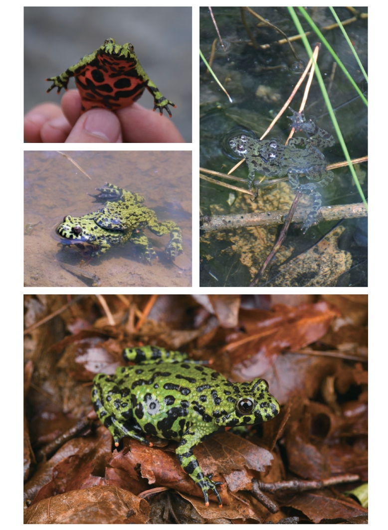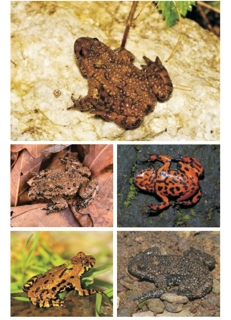 Description Adults up to 30-45mm in SVL.Head flat, HL wider than HW; snout tip rounded; tympanum and vocal sacs absent; two round vomerine teeth.Skin is rough, lots of warts on the head, body and limbs, especially bigger warts on the lateral.Dorsum is greybrown or green, with black or black brown spots; orange toes; striking bright yellow to red(generally bright reddish-orange) and black patterns on the belly.During breeding season,black spines on the inside of the males' forelimbs, inner metacarpal tubercle and the inside of fingers I, II and III.