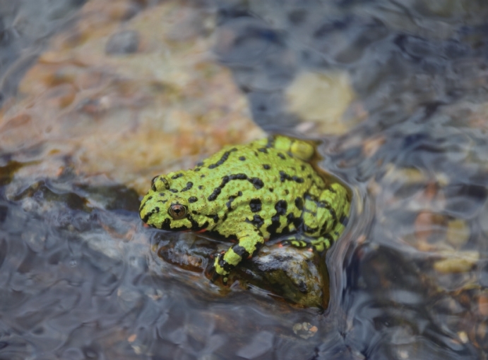 Behaviour Bombina orientalis live in elevations below 900m, in or near the waters in the mountains, hills and plain.They prefer floating on the water or lying on the land and rocks near the water.They can crawl but they are not nimble.Being stimulated, their heads and anus will raise up or turn over to show their orange belly, serving as a warning.The toxin is secreted through the skin mostly from the skin on the back, in a milky-like substance when the frog is disturbed or frightened.At the breeding site, males grips the females' hip tightly with its forelimbs.Normally, they spawn in the paddy field or still water puddle.Sometimes they spawn with Kaloula borealis at the same place.The eggs hatch into aquatic larvae in 3 days when the water is up to 24 to 25℃.The larvaes may be holometabolous at the end of August.They feed on small invertebrates.