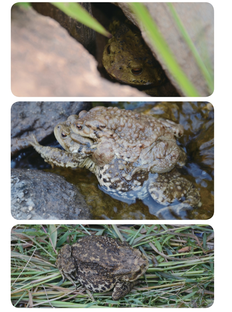 Behaviour Bufo gargarizans live in various moist places, from coastal lowland to the plateau mountains.They spawn and spend the winter in the water whereas they are terrestrial during acting season.The toxin is secreted from the glands behind the ears, in a milky-like substance when the frog is disturbed or frightened.Around Bohai Sea, they begin to breed in March and continue to the beginning of May.When mating, males grip females'armpit and breast tightly with its forelimbs.Normally, they spawn in the still waters, such as ponds and ditchis.There are 2,700 to 8,000 eggs in the egg strings, twining on the aquatic weeds and branches.The tadpoles are dark grey black, living in the still waters, acting in group and feed on plants.The eggs hatch into aquatic larvae in about 64 days.They begin to spend the winter in September and October, digging their holes under the water or near the water.The adult ones feed on small invertebrates and small vertebrates.