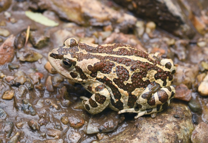 形态特征:雄性体长60mm左右,雌性个体略大。头宽大于长,吻端圆形,吻棱明显,无犁骨齿,鼓膜椭圆形,耳后腺大而宽扁,四肢粗短。雄性皮肤较粗糙,头和体背部及上眼睑散布大小腺瘰;雌性皮肤略光滑,腺瘰稀疏。四肢背部较光滑,腹面均匀密布扁平小圆疣。雄性背部淡棕黄色或橄榄黄而显绿,缀有零散咖啡色斑块;雌性体色醒目,背部多为青灰色,密布较大的块状红褐色或棕色斑纹,正中背脊自两眼间至肛上缘有条纵直线纹,线纹上无斑,正好将背上斑块明切左右分开,相对醒目。繁殖期时,雄蟾内侧3指及内掌突上有黑色婚刺。