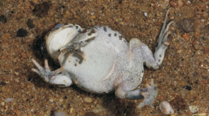 Description Adult males SVL normally up to 60mm, females bigger than males; HL wider than HW; snout tip rounded; canthus rostrals obvious; vomerine teeth absent;tympanum oval; parotoid glands big, board and flattened; limbs stout and stumpy.Rough skin of males, different size of granular glands on the head, back and upper eyelids; smooth skin of females, with less granular glands; smooth limbs and dorsum; flattened rounded warts on the belly.Dorsum light brown yellow or olive yellow of males, with scattered brown spots; striking color of females, caesious back dorsum, with bigger reddish brown and black brown spots and a vertebral pattern on the spine from the middle of the eyes to the edge of the anus, no spots, dividing the spots on the dorsum.Black spines on the inside of males'fingers I, II and III during breeding season.