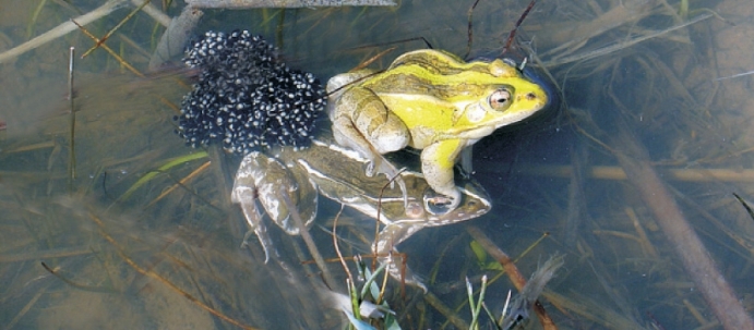 生活习性:黑斑侧褶蛙是我国最常见的蛙类,生活于海拔2200m以下的稻田、水沟、池塘和湖沼等静水域和河流的缓流区域。10月入眠,翌年3月末出眠后进入繁殖期,并开始产卵,产卵期延续到6月初旬,4—5月为繁殖旺盛期。产卵量多少与个体大小相关,最多可达5000粒左右。蝌蚪当年完全变态。