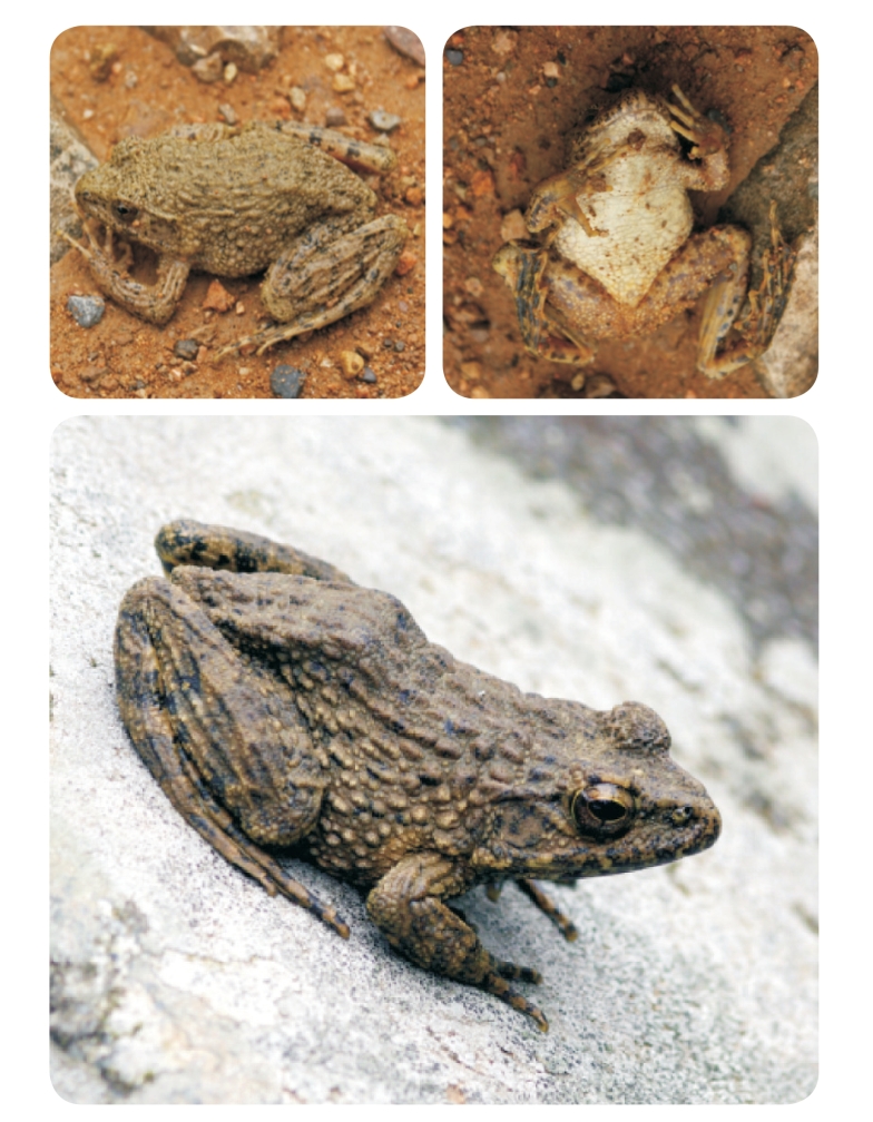 Description Adult males SVL normally up to 43mm, females up to 55mm; HL equals to HW; obtuse snout tip; tympanums bigger; two round vomerines.Skin is rough; lots of warts on the dorsum, lateral and limbs.Bigger warts on the back form the stubby vertebral skin ribs; small skin ribs also appear on the outer of limbs; lots of flattened warts on the belly;stubby hindlimbs; the tibio-tarsal articulation reaching the eye.Males have vocal sac, gray nuptial pads on finger I.Skin varies in color, khaki and yellowish-brown body with black spots; gray belly; thorax and both sides of the belly are yellow; the back of the limbs have dark transverse lines; light yellow inner rare legs with gray spots; a black vertebral stripes on the upper lip's edge.