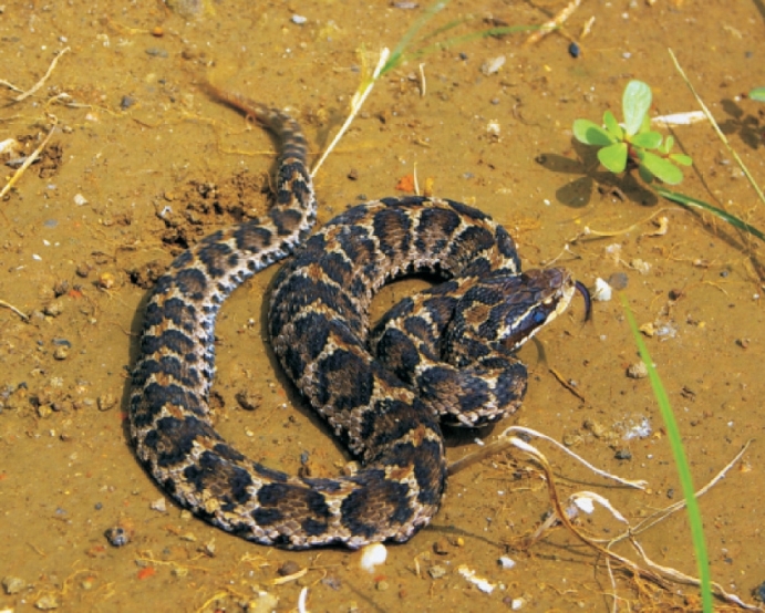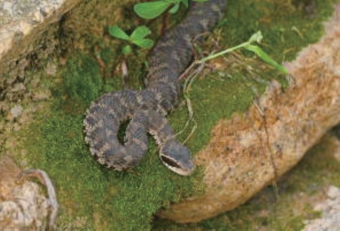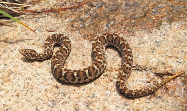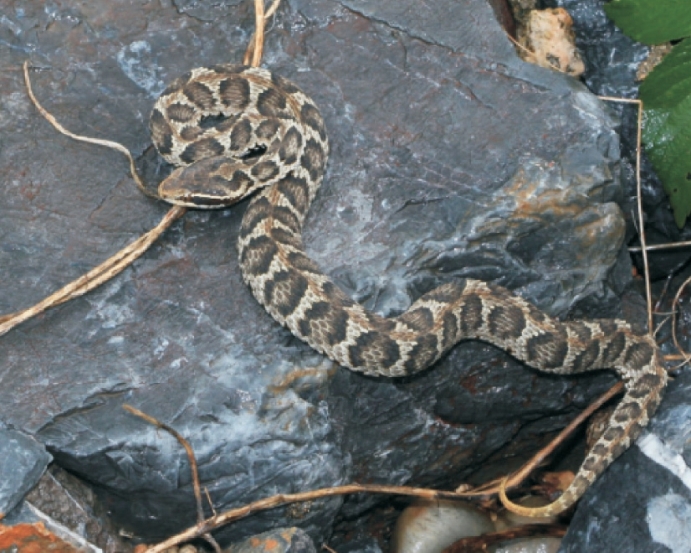形态特征:体较短粗,全长450~600mm。头略呈三角形,与颈区分明显;吻棱明显。具管牙;有颊窝。头背深棕色,枕部中央有一块浅褐色桃形斑;眼后到颈部有一条镶深棕色边的褐色纹,其上缘又镶白色纹;上唇缘和头腹面灰褐色。颌片外侧有一对左右对称的棕色或黑色斑,与乌苏里蝮明显区分。体背面浅褐色,正背面有两行深棕色近圆形大斑,彼此交错排列,圆斑中央色略淡。体腹面灰白色,密布棕黑色细点。尾尖淡黄色。上唇鳞7枚,呈2-1-4式,下唇鳞多10枚。背鳞以21-21-17行为主,除最外一行平滑外均起棱。腹鳞雄性135~168枚,尾下鳞22~47对,肛鳞完整。