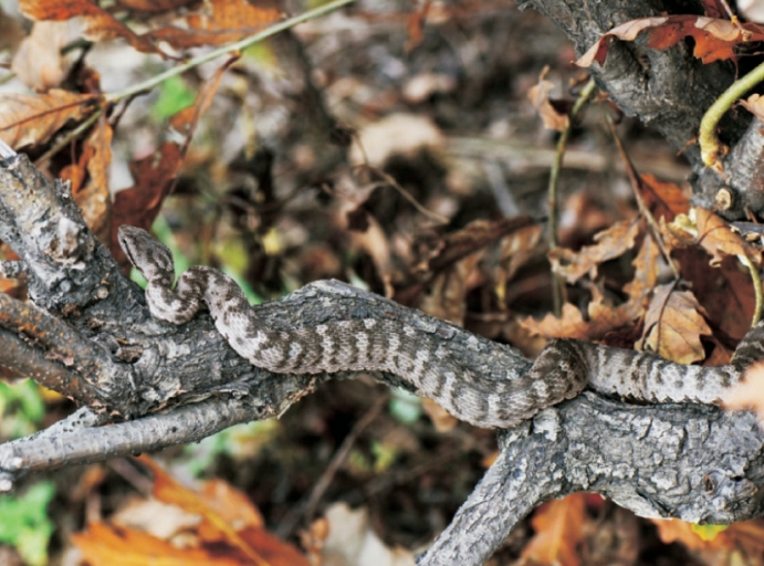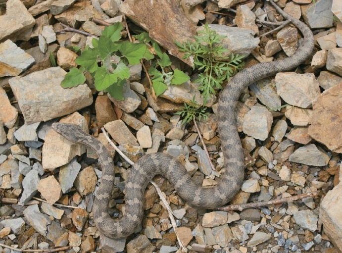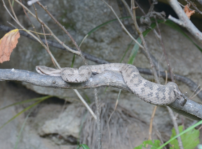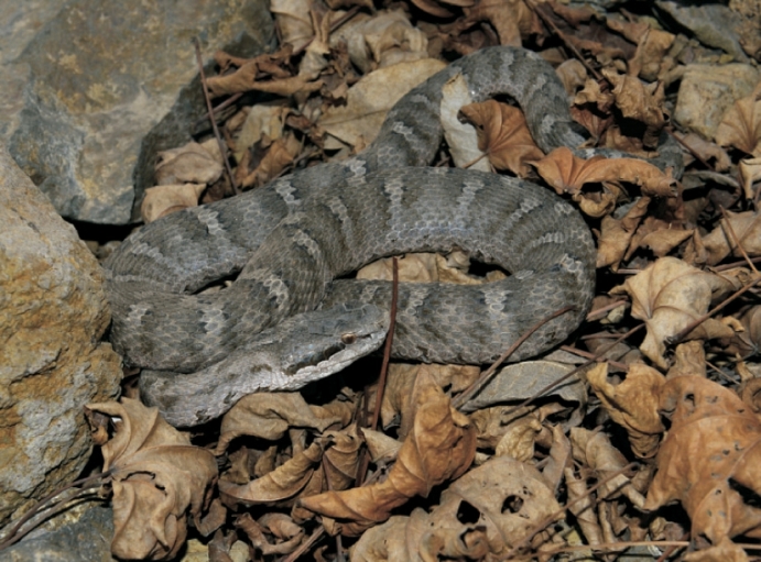 形态特征:体型较指名亚种细小,成体全长雄性535~742mm,雌性585~725mm。尾长雄性75~101mm,雌性70~90mm。头呈三角形,较指名亚种宽扁(也有部分头形狭长者),颈细,尾较短。具管牙;有颊窝。头背至枕部有黑褐色坩埚钳形斑。眼后有一块黑褐色窄带状斑,宽约2mm。体背瓦灰色,自颈至尾具不规则“X”形黑褐斑(也有部分个体呈横斑)。腹面、下唇、下颌灰白色,自颈向后灰黑逐渐变深。上唇鳞多7枚,呈2-1-4式,也有部分8枚,呈2-1-5式。下唇鳞10~11枚。背鳞起棱,23-23-17行。腹鳞158~167枚,尾下鳞36~49对,肛鳞完整。