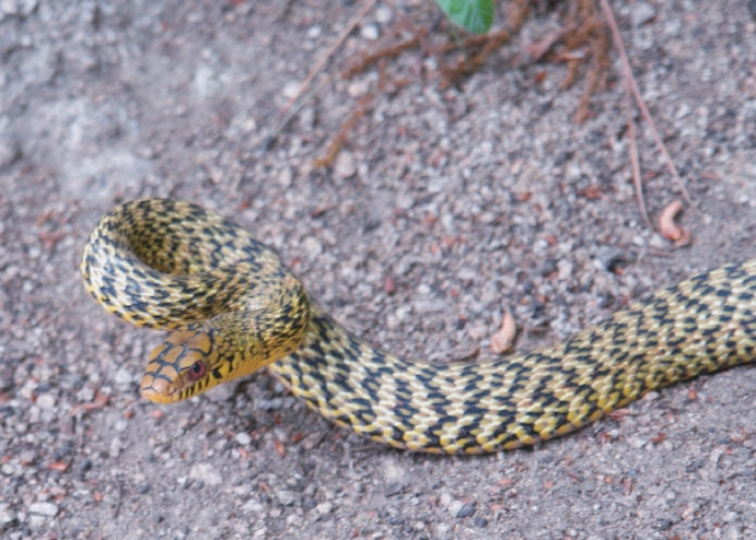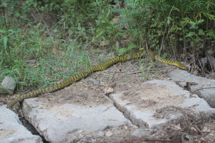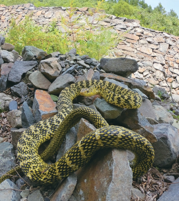 Description Adults up to1,200-2,400mm TOL, body size is relatively large.There are great difference between juvenile's and adult's spots; juvenile's dorsum is light yellowish brown, with four reddish-brown ventral stripes extending from the back of the neck to the tail end, with a number of reddish brown or dark brown short lateral stripes; sparse black,brown and yellow spots on the adult's dorsum; the center of scales are yellow, with black rim; black color is connected together with short lateral stripes or grid lines; the front part of the ventral is yellow, rear part is greyish blue; body is covered with black spots; scales groove on the back of the head are black, in “王” pattern, so being named “King”snake; 8 supralabials are arranged in 3-2-3 rows and 10 or 11 infralabials; dorsal scales are mostly arranged in 23-23-19 rows; 65-103 pairs of subcaudals; 2 anal plates on the anus.