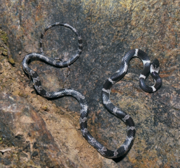 Description Adults up to 725 mm TOL, body is small and non-toxic.Scales between the nose are one pair; 1 pair of forehead scales; one head scale; one pair of top scales;supraorbital scales on both sides; 1 pair of anterior orbital scales; two pairs of posterior orbital scales; temporal scales arranged in 2+2; a buccal scale in the orbits.8 supralabials and 10 infralabials.two pairs of jaw pieces with groove; dorsal scales are slightly ribbed;17 rows of dorsal scales are in the middle part of the body; 15 rows near the tail end; 219 ventral scales; anal plate complete; 94 pairs of subcaudals arranged in two rows; the head and the body are black, with a pair of white stripe at the occipital part; nearly 60 white circle stripes from the neck to the tail end, the stripes on the neck are narrow, gradually dense and wide backwards; head and neck are obviously separated; head is slightly in triangle-shaped; snout is round and blunt; snout scales are seen from the head dorsum.
