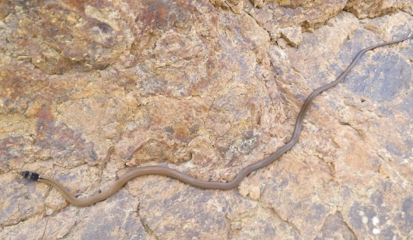 形态特征:体形细长的小型无毒蛇,成体全长600~800mm 。头背灰黑色(偶见棕色),上唇鳞白色,头颈部有一块黑斑,黑斑后缘有一条细白横纹,颈部后段常有一段黑色细纵纹。体背棕褐色,腹部白色,具腹链纹。上唇鳞多为9枚,呈3-3-3式,下唇鳞多为8枚,第4枚最长,第5枚最大。背鳞17-17-17行,平滑无棱。腹鳞171~187枚,尾下鳞58~122对,肛鳞完整。