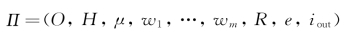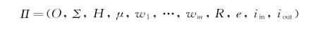 其中,O是对象字母表;Σ表示输入字母表;H是膜标签的有限集合;μ表示膜结构,包含m个膜,每个膜的标签号是集合H中的元素;w1,…,wm为O上的字符串,用来表示各个膜内在初始状态下的对象多重集;R为规则的有限集合;e是规则有限集合中规则执行时间的映射;iin∈{1,2,…,m}表示输入膜;iout是输出区域,用来保存最后的计算结果。工作字母表中包含两种物质“yes”和“no”,当系统停止时,物质“yes”或者“no”会出现在输出膜iout中。