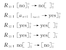 另外,H={1,2}为膜标签的集合;为初始膜结构;w1=no,w2=a1是各个膜内初始物质;iout=0是保存最后计算结果的输出区域;通过时间映射e:R→N来指定每条规则的执行时间,其中R是