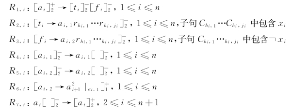 当变量x i(1≤i≤n)的第一次循环执行结束时,膜标签为2的膜中包含一个对象a 2。在对象a 2的作用下,规则R 1,2在每个膜2中同时开始执行产生4个具有相同膜标签为2的新膜。后面的计算过程类似于变量x 1第一次循环计算过程(即从规则R 1,1到R 7,1的执行过程)。以下用“当前变量”表示每次变量循环计算过程中正在执行的变量,其值对应着取值范围1≤i≤n中的某个x i值。系统继续为变量x 2赋值(真和假),可以获得当前变量赋值满足的所有子句。该过程最多需要6个RS步。当变量x i的第二次循环执行结束,系统继续为其余变量赋值。类似地,每个变量持续不断地分裂,寻找当前变量赋值满足的所有子句。一般来说,对于变量x i的第i次循环计算过程(1≤i≤n),当规则R 4,i和R 5,i执行结束的时候,通过应用规则R 6,i,对象a i,2进化为两份对象a i+1。因此,对象a i+1的数量和具有膜标签为2的膜的数量是相同的。因此,当应用规则R 7,i时,注意到标签为2的膜上电荷从负变为正。因此,规则R 7,i可以确保每个膜2内都会出现一份对象a i+1。此外,由于P系统的极大并行性原理,对于所有膜标签为2的膜,规则R 7,i的应用是同时完成的。