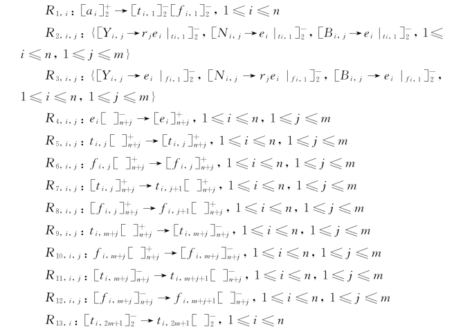 当规则R 1,1执行结束时,规则R 2,1,j和R 3,1,j(1≤i≤m)同时开始执行。作为促进剂的对象t 1,1和f 1,1分别对应检查所有子句中变量x 1的赋值为真和假是否是可满足的。通过应用规则R 2,1,j和R 3,1,j,在促进剂t i,1(resp.,f i,1)的作用下对象Y 1,j(resp.,N 1,j)进化为对象r j和e 1;其他情况下只能生成对象e 1。对象r j表示对应子句是变量赋值满足的子句。后面用“当前变量”表示每次变量循环计算过程中正在执行的变量,其值对应着取值范围1≤i≤n中的某个值。通常,对于当前变量x i,有m个子句对应于规则R 2,1,j或R 3,1,j中的m条规则。对于规则R 2,1,j或R 3,1,j,需要注意的是,其中包含的所有规则在促进剂的作用下同时开始执行,但每条规则执行时间是任意一个从R到N的不同时间映射,因此它们的完成时间可能不同。该计算过程仅需一个RS步。